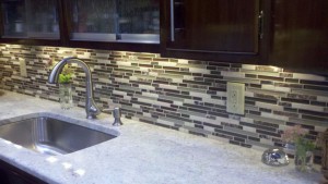The backsplashes below have the same tile installed; Bliss Cabernet Linear Mosaic Mix of Glass and Stone. As you can see the overall finished installations look very different. Why? The top backsplash used Mapei #42 Mocha, a dark brown grout and the bottom backsplash used Mapei #94 Straw, a neutral grout color.